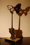 2008Butterflybutterfly. Stokmasker op houten sokkel op koperen plaat. Een vlinder betekend voor mij een fragiel leven, welke in (principe in) alle vrijheid wordt geleefd. En dat is, denk ik, met ieder leven zo. Size stick mask: H 40 cm.W 23 cm. D 6 cm.