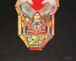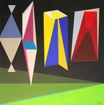 2010Past Present Future. Rechts de donkere pyramides uit de oudheid. Daarnaast de groene weg naar de toekomst met de figuurtjes. De man uit het verleden en in het midden het kind van de toekomst en links de vrouw die de toekomstige kinderen gaat baren. Links de zuil vanuit het verleden naar de toekomst. In het midden het gebouw van de wetenschap.
